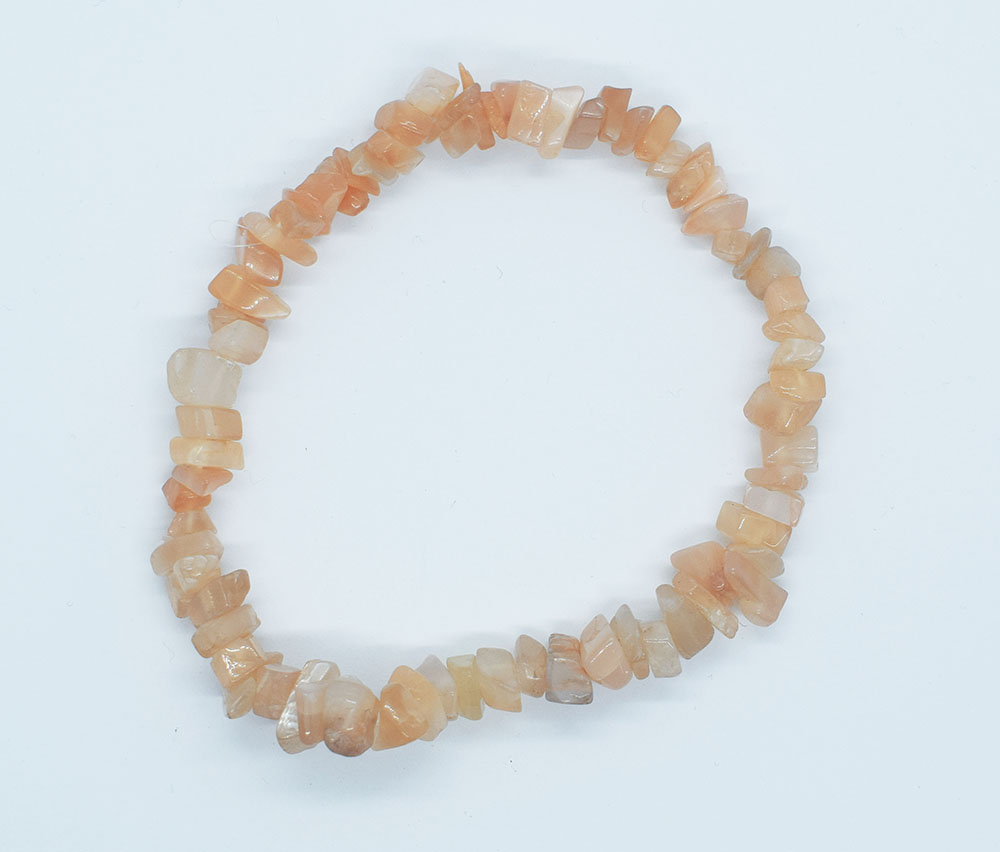 Peach Moonstone, said to share the same divine feminine energies as other Moonstone varieties such as protective, creative and loving qualities, but offers an extra special connection between your heart and personal will. Believed to align with crown, third eye, heart and solar plexus chakras. This Peach Moonstone chip bracelet has been carefully shaped and polished to bring out the beautiful colour of the stone. It is strung on coordinating elastic that fits any wrist, making it comfortable and easy to wear. This beautiful Peach Moonstone bracelet is a great way to harness the rich energies of this stone during meditation or during everyday use as a fashion accessory and it looks great worn with other crystals. All Peach Moonstone bracelets are unique and there are no two alike. You will receive 1 Peach Moonstone bracelet similar to the one in the image posted.