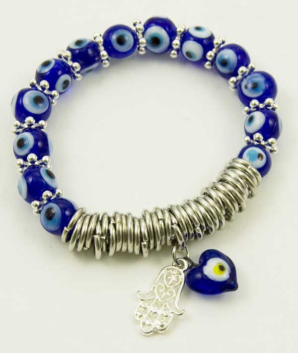 Bracelet Glass Turkish Eye Blue 12mm With Heart And Hand Charm