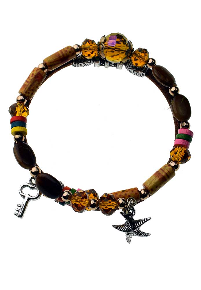 Bracelet Brown Cotton With Long And Oval Beads And Metal Charms