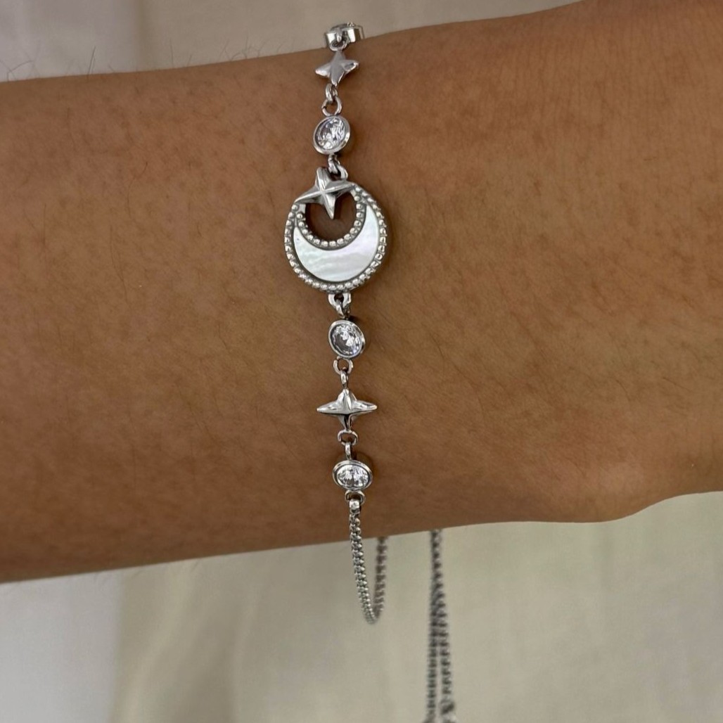 Bracelet Stainless Steel Moon And Stars Moonstone 16K White Gold Plated