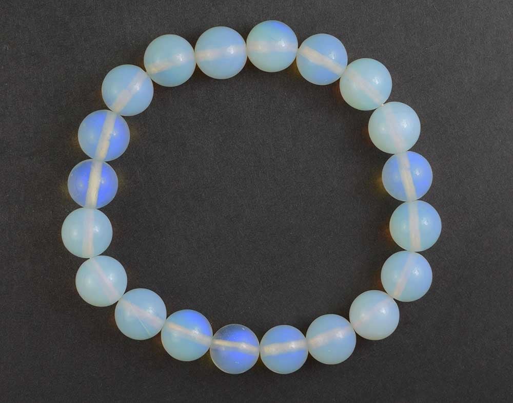 This Opalite bracelet has been carefully shaped and polished to bring out the beautiful colour of the stone. It is strung on coordinating elastic that fits any wrist, making it comfortable and easy to wear. This beautiful Opalite bracelet is a great way to harness the rich energies of this stone during meditation or during everyday use as a fashion accessory and it looks great worn with other crystals.