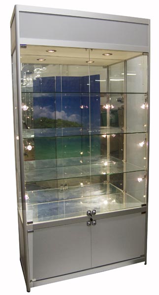 Cabinet 1000X400X1980mm With Tempered Glass And Aluminium Frame In Grey Colour. Mirror Back And Base. Fitted With 15 LED Lights And 3 Shelves. Complete With Storage At The Bottom And Adjustable Feet With Wheels.