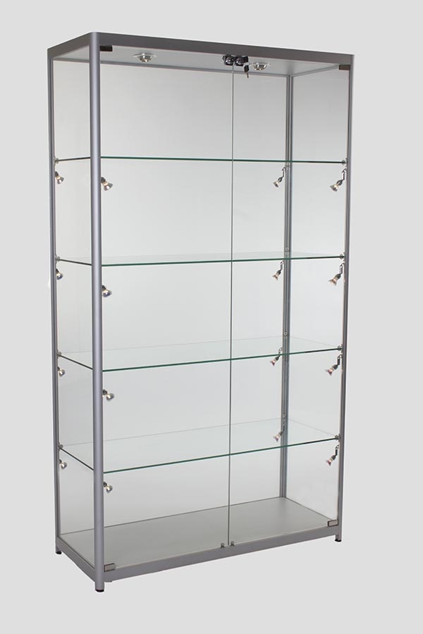 Cabinet 1000X400X1980mm With Tempered Glass And Aluminium Frame In Grey Colour. Mirror Back And Base. Fitted With 4 Shelves Containing Two LED strip Lights under each shelf and And 3 led buls On The Top. Adjustable Feet With Wheels.