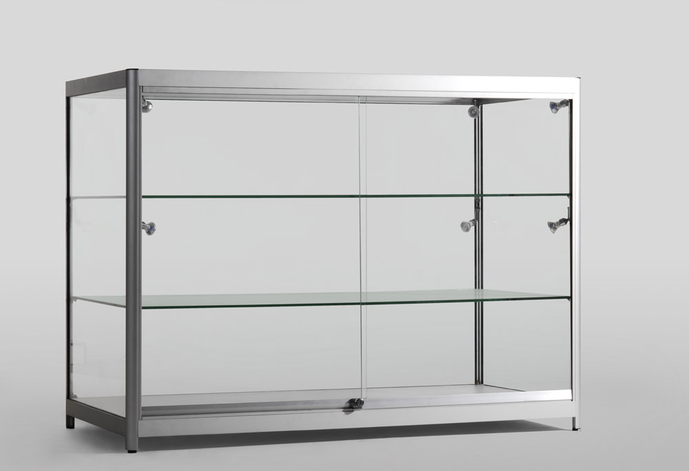 Cabinet 1200X600X1050mm Counter With Tempered Glass And Aluminium Frame In Gray Colour. Fitted With 4 Strip Lights – 2 On Top And 2 Under The First Shelf. 4 LED Bulbs On The Bottom. 2 Glass Shelves. Adjustable Feet With Wheels.
