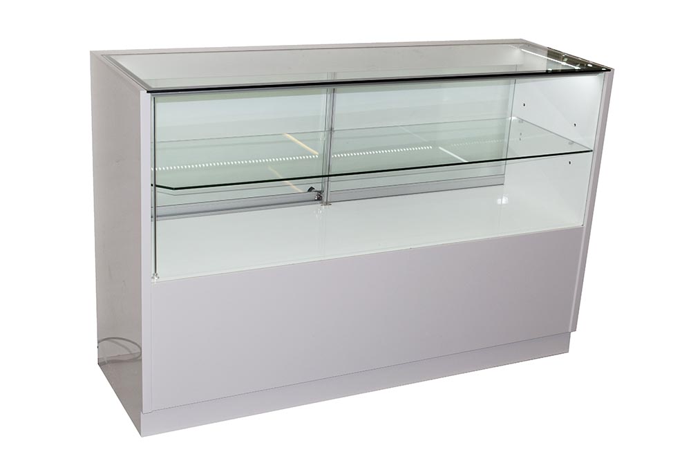 Cabinet 1500X500X1000mm White Hi Quality Glossy Counter one glass shelf With 1 Horizontal LED Strips Inside The Cabinet .Two Lockable Drawers as Storage.