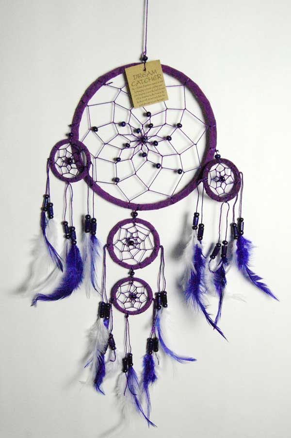 Dream Catcher 4 Hanging Circles With Feathers And Wood Beads Purple 16cm