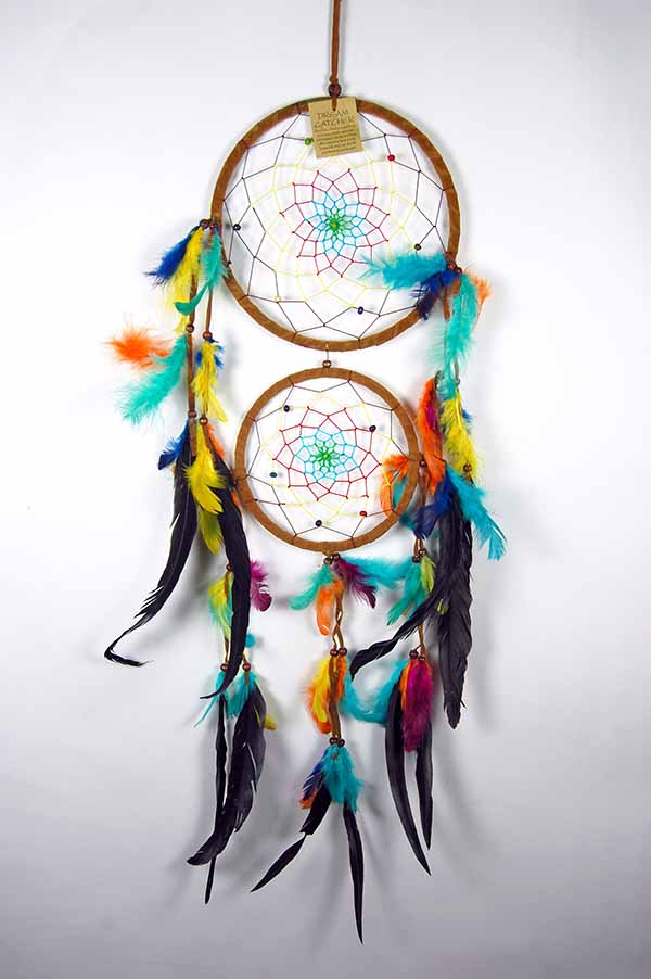 Dream Catcher Brown Double Circle With Coloured Feathers 21.5cm