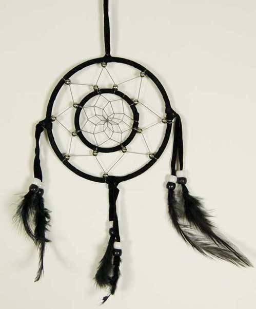 Dream Catcher Double Circle Black With Feathers And Beads 4.5 Inch