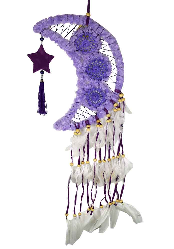 Dream Catcher Moon Crochet Knit With Fluffy Edge Purple With Beads 32cm
