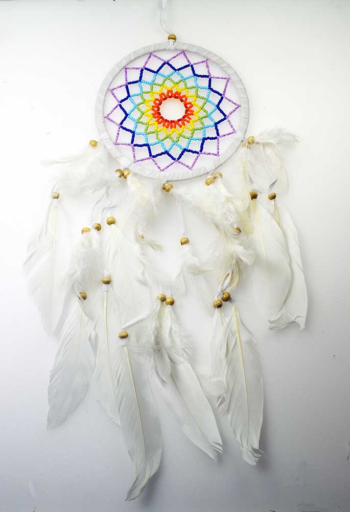 Dream Catcher Natural With Multi Colour Beaded Thread And White Feathers 16.5cm
