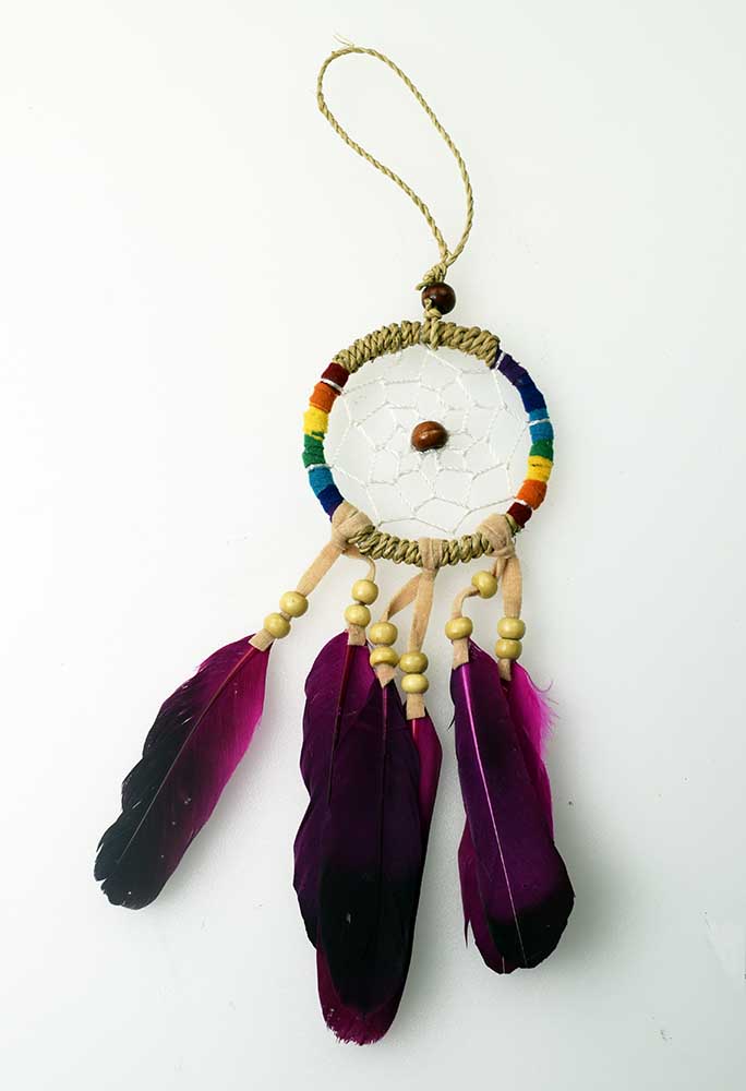 Dream Catcher Natural With Chakra Colours And Pink Dip Dyed Feathers 6cm