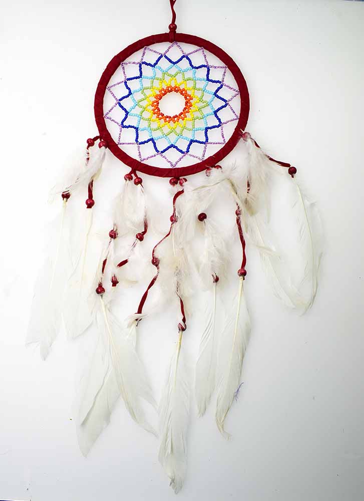 Dream Catcher Red With Multi Colour Beaded Thread And White Feathers 16.5cm