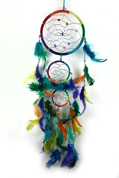 Dream Catcher Triple Circle Rainbow With Beads And Feathers 12cm