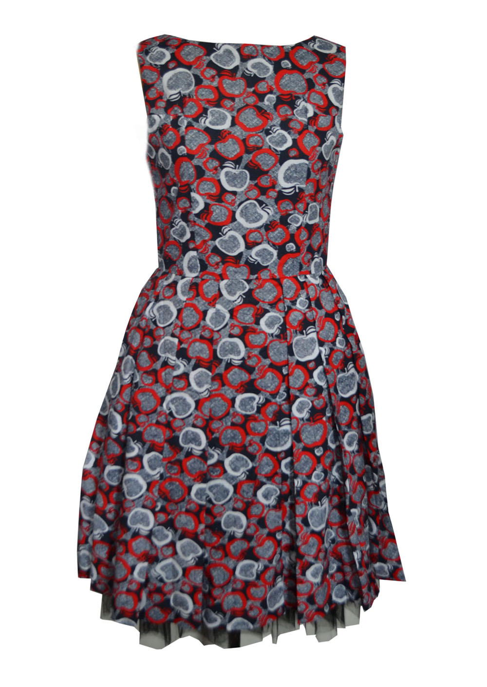 Retro by Jordash Dress Grey Knee Length. Apples Design With Round Neck And Front Pleats