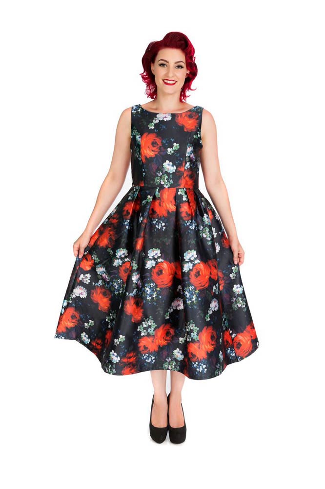 Dress Long Black With Red Roses Poly Silk Retro Rockabilly Style