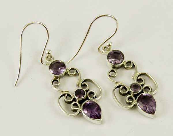 Silver Earring Amethyst Cut Drop With 3 Stones And Fancy Swirls L3cm