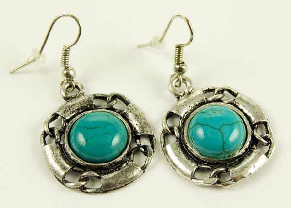 Earrings Pewter And Turquoise Circular Shape Stone With Link Rim