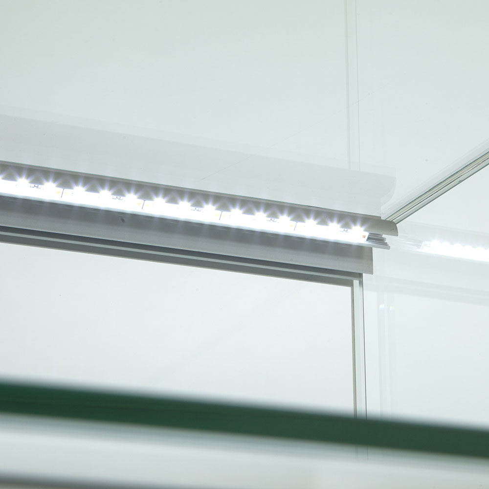 The cabinet uses LED lighting, there are 8 horizontal LED strip lights inside which gives you the best possible uniform lighting with no shadow to show off your products to their full potential.