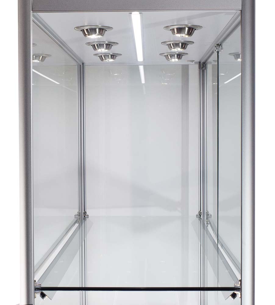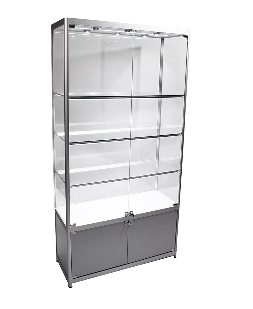 Built using a robust aluminium frame in Satin Silver with tempered glass measuring 8mm in thickness and fully lockable doors, this provides you with a professional, secure and long lasting display cabinet.