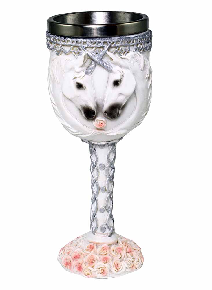 Goblet Double Unicorn Design. White With Pink Roses. Made From Poly Resin. Size 9X8.5X19cm