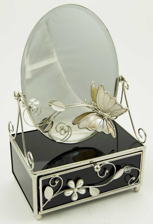 Jewellery Box Black Glass With Drawer And Mirror With Metal Pearly Butterfly And Flower L12XW8XH21cm (Height Measurement With Mirror)