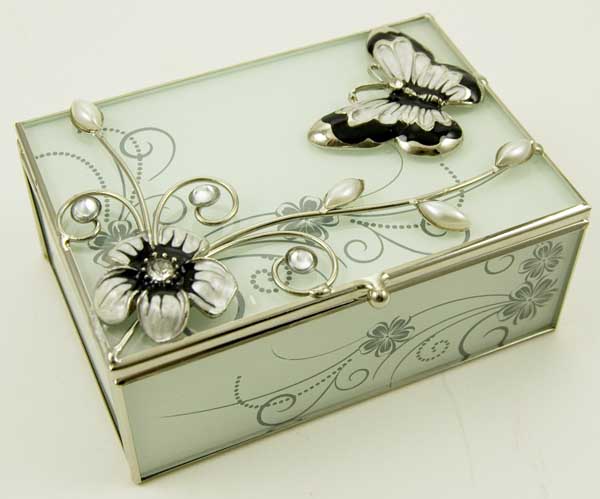 Glass Jewellery Box White With Black And White Butterfly And Flo