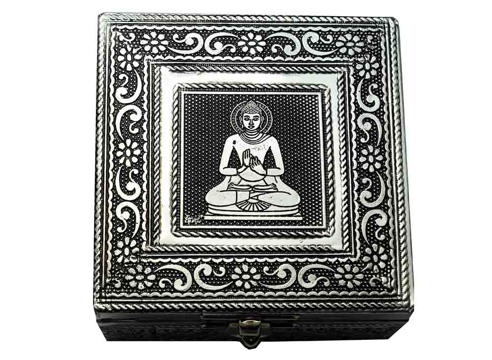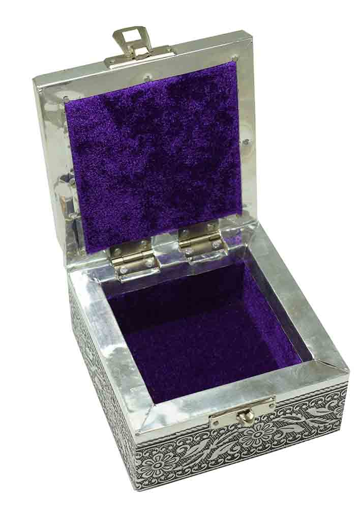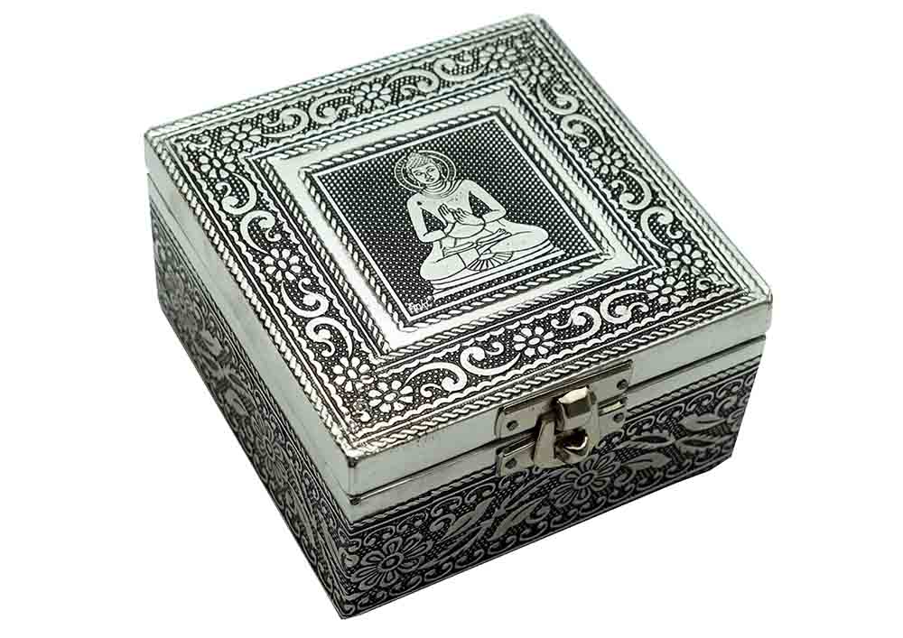 Jewellery Box Metal Square With Buddha Sitting Design On Lid And Purple Velvet Inlay 4X4X2.25 Inch
