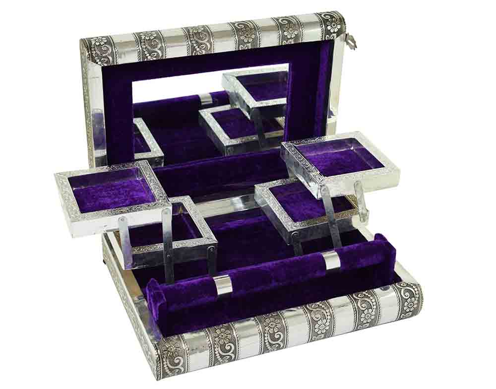 Jewellery Box Metal Rectangle With Buddha Sitting Design On Lid And Purple Velvet Inlay 11X8X3 Inch