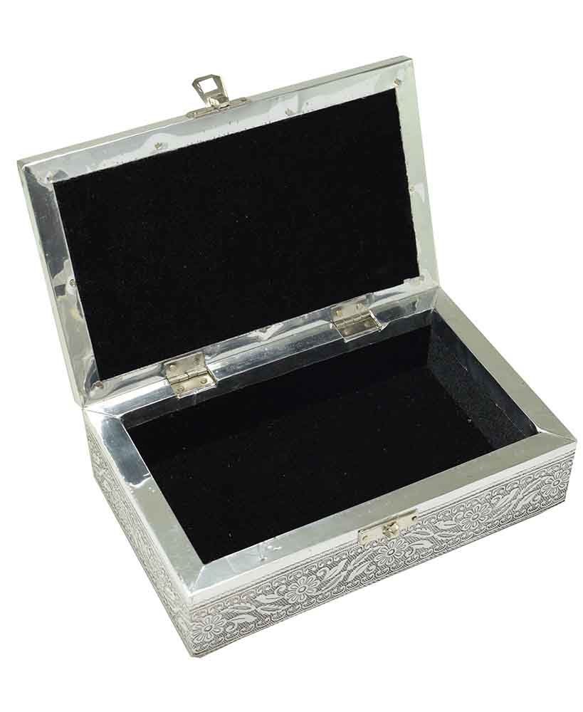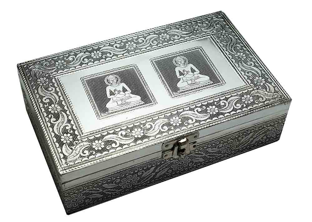 Jewellery Box Metal Rectangle With Double Buddha Sitting Design On Lid And Black Velvet Inlay 8X5X2.25 Inch