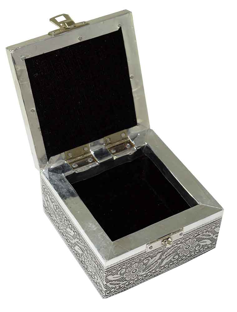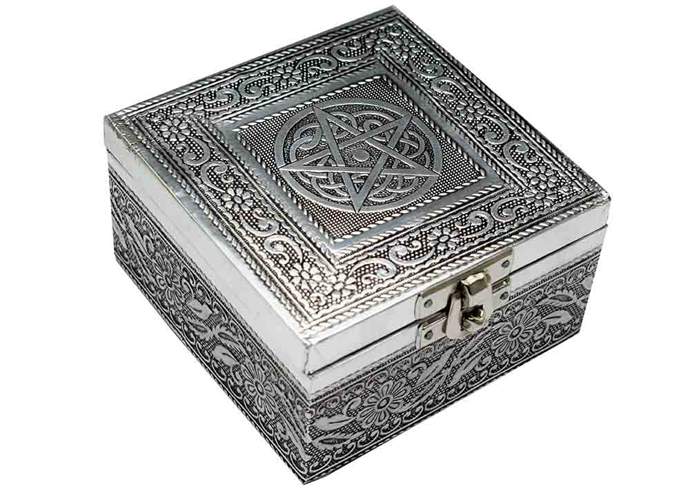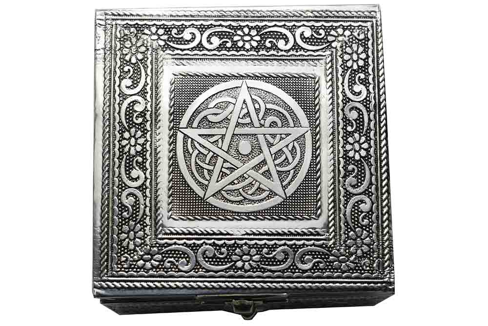 Jewellery Box Metal Square With Pentagram Design On Lid And Black Velvet Inlay 4X4X2.25 Inch