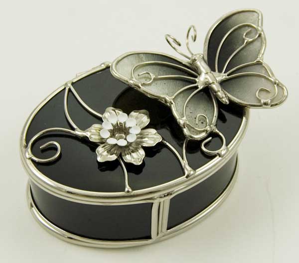 Jewellery Box Oval Black Glass With Pearly Butterfly And White Flower W7.5XH3cm
