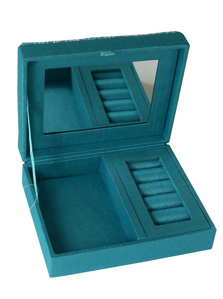 Jewellery Box Rectangle Embroidered Turquoise With Mirrors 4X5X1.4 Inch