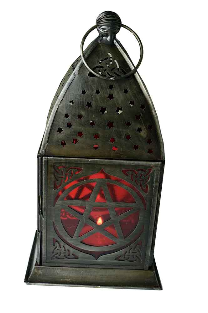 Lantern Candle Holder Hexagonal Zinc Antique With Pentagram On Plain Embossed Glass Dark Red H21cm x W12cm