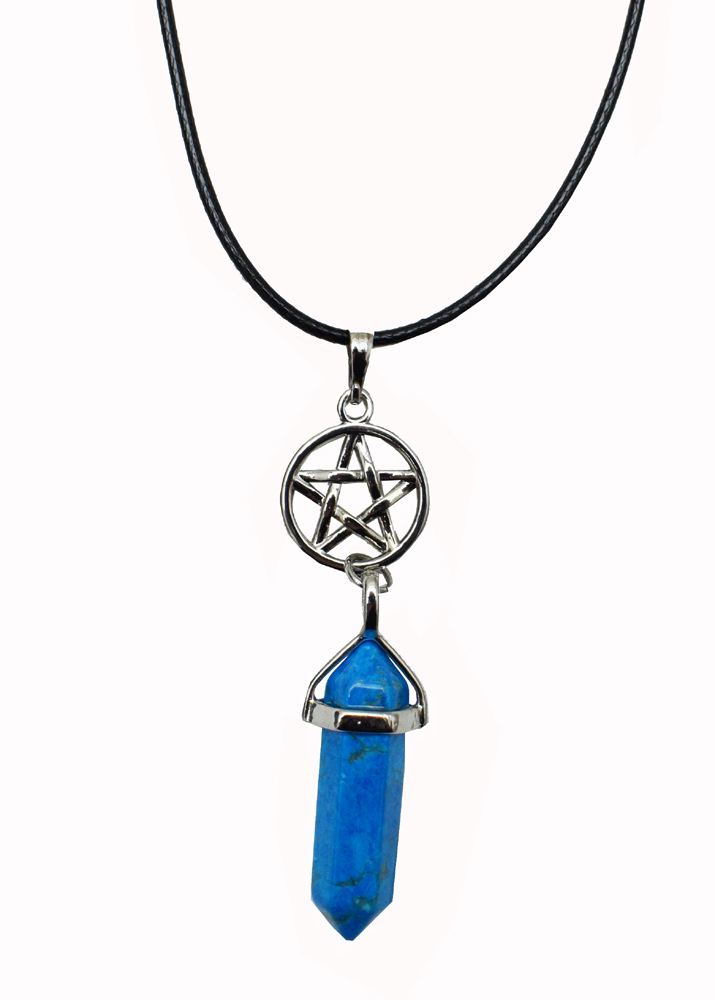 Necklace Fixed Wand Blue Howlite With Pentagram On Wax Cord