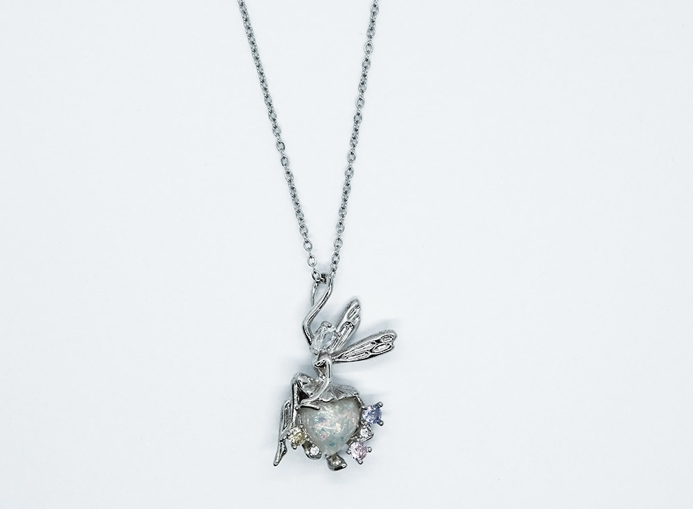 Necklace Stainless Steel Hallmarked Fairy Heart Fairy On Opal Heart
