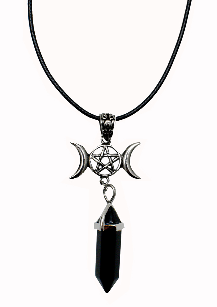 Pendant Fixed Wand Obsidian Triple Moon On Wax Cord