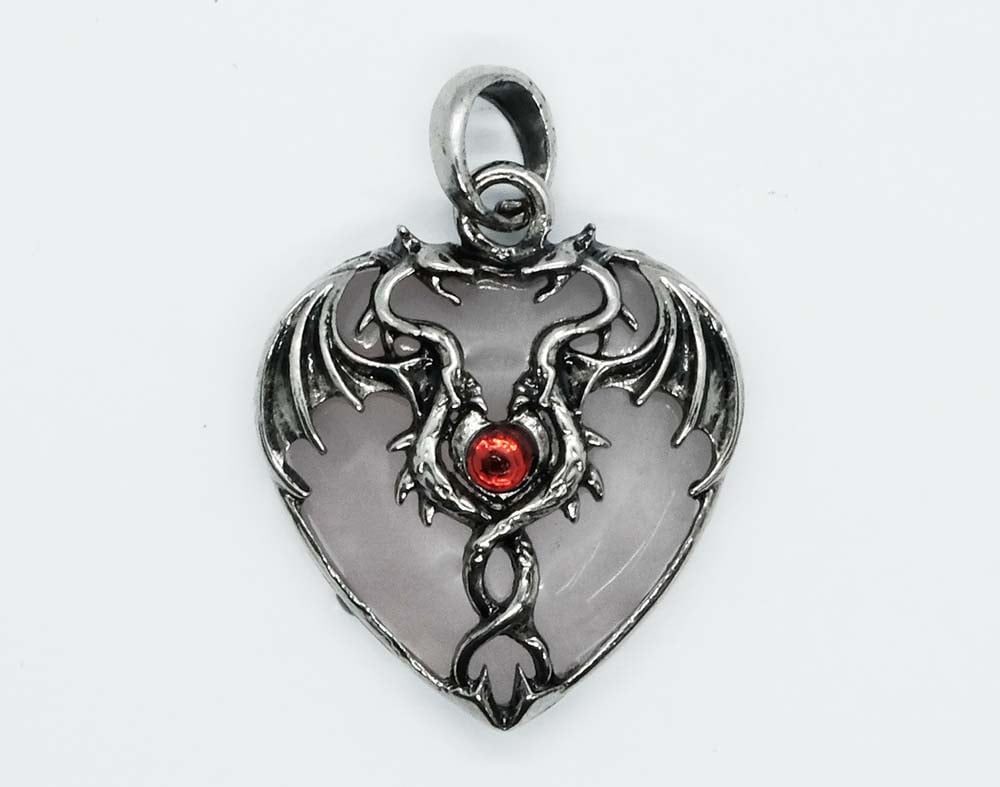 Pendant Dragon On Rose Quartz Heart With Red Stone