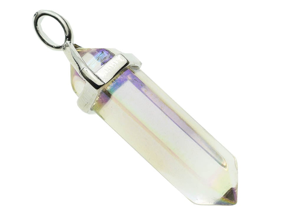 Angel Aura Quartz, also known as the ”crystal of new horizons and divine angelic connections”, said to be a highly vibrational stone, said to increase joy, happiness, uplifts energy, help with emotional instability, stress; and aid with meditation.