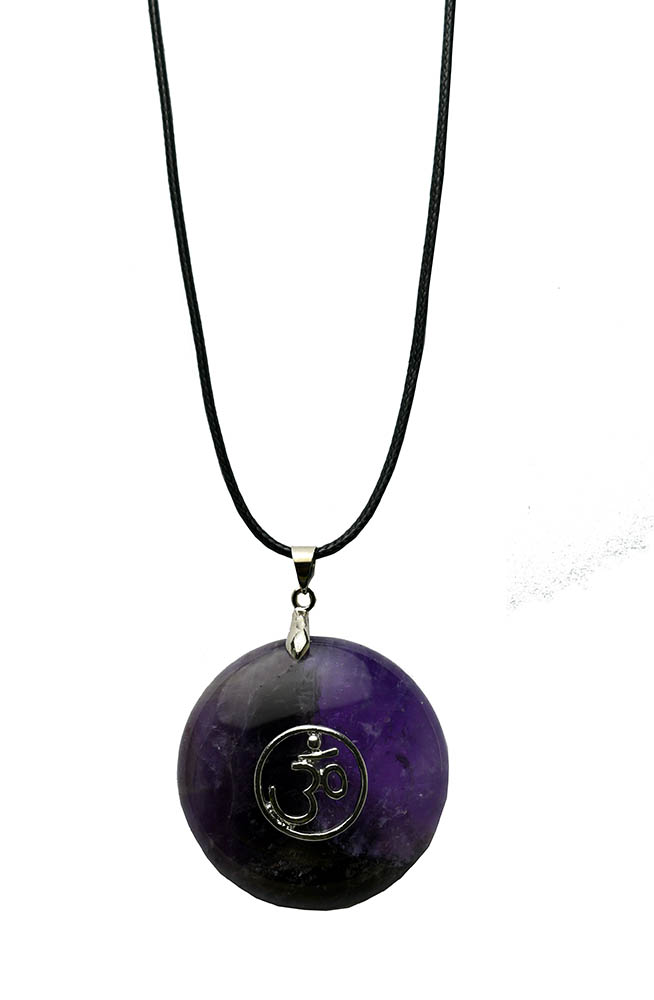 Pendant Om In Circle With Amethyst Stone On A Wax Cord Necklace