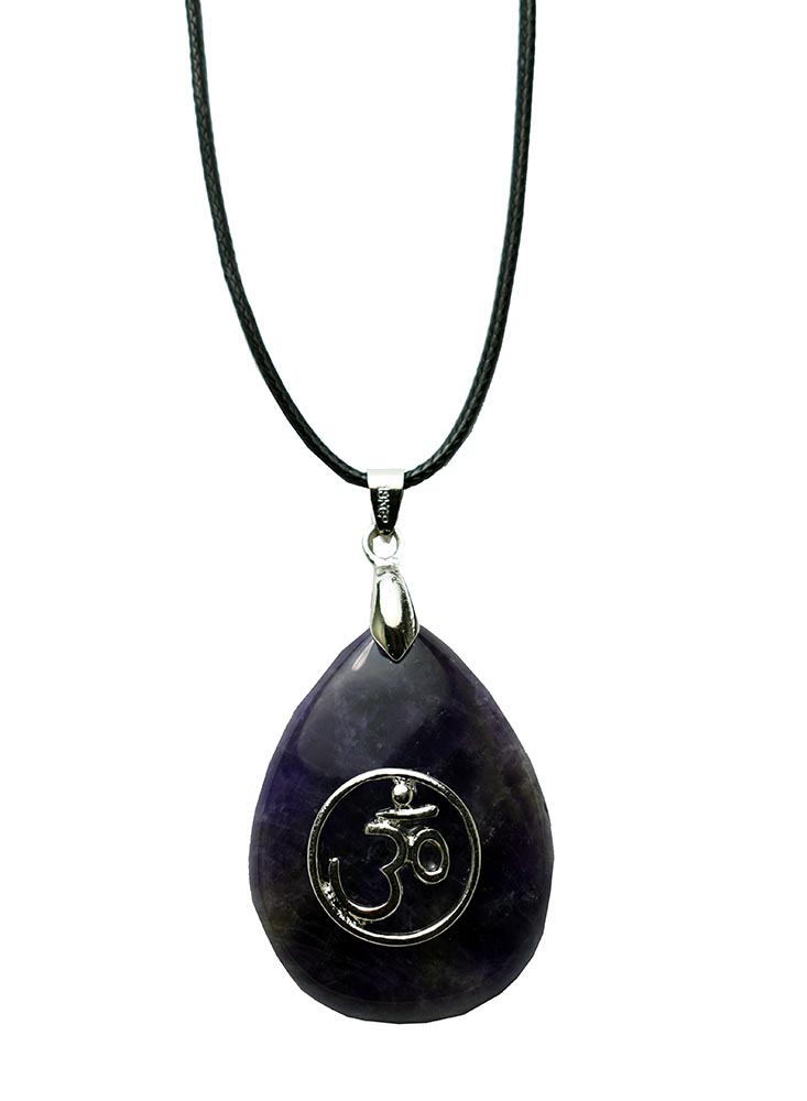 Pendant Om In Circle With Amethyst Stone On A Wax Cord Necklace