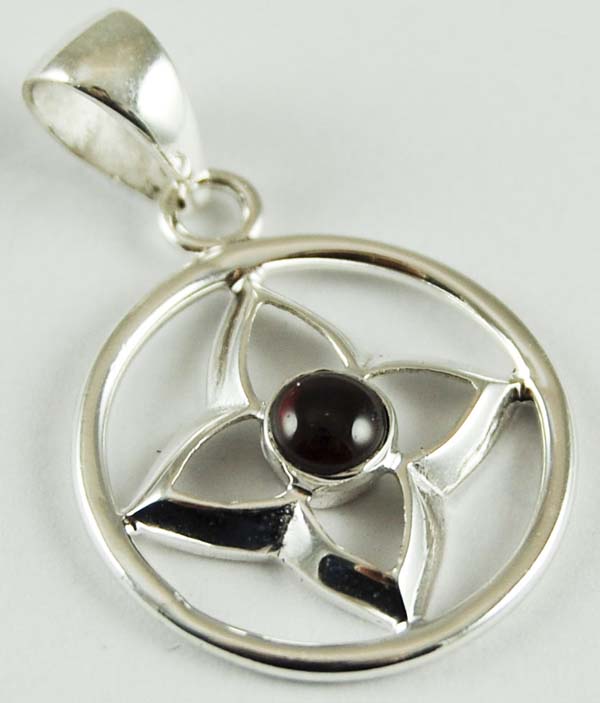 PENDANT SILVER GARNET CAB FLOWER IN CIRCLE 25MM