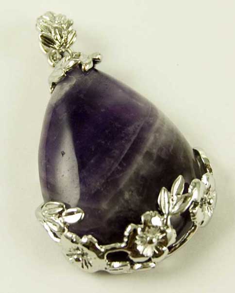 Pendant Tear Drop Shape Amethyst Stone Encased With Silver Plated Floral Design
