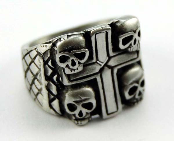 Pewter Cross Ring With 4 Skulls
