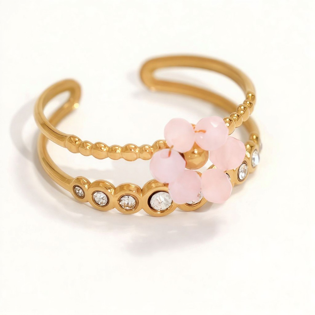 Ring Pink Flower Stainless Steel 18K Yellow Gold Plated Adjustable Waterproof Non-Tarnish