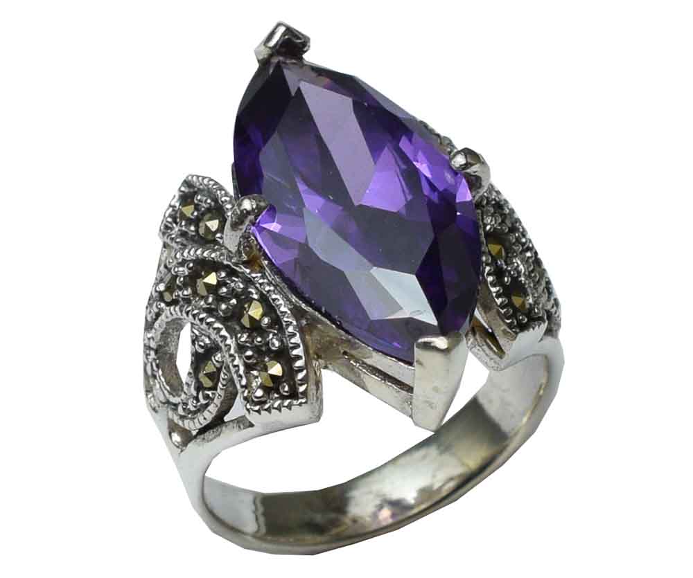 Ring Silver Oval Stone Amethyst 23mm With Marcasites