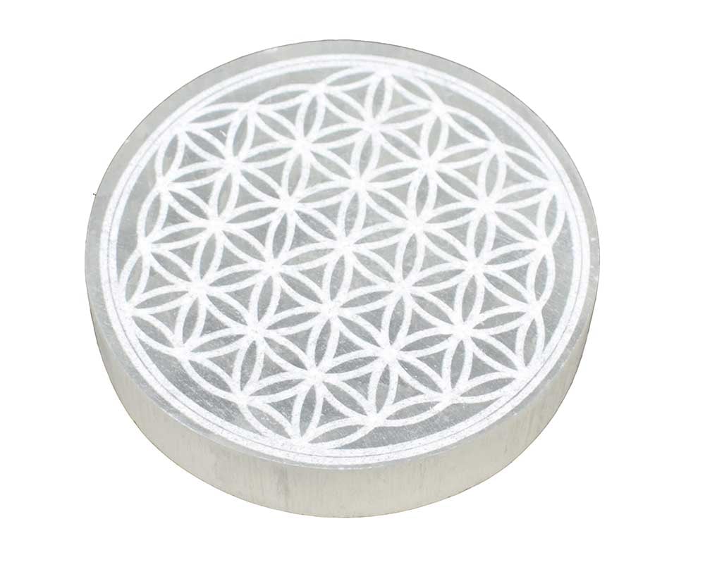 This beautiful Selenite healing crystal is polished and shaped into a beautiful shape of a charging plate engraved with a Flower of Life pattern.