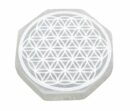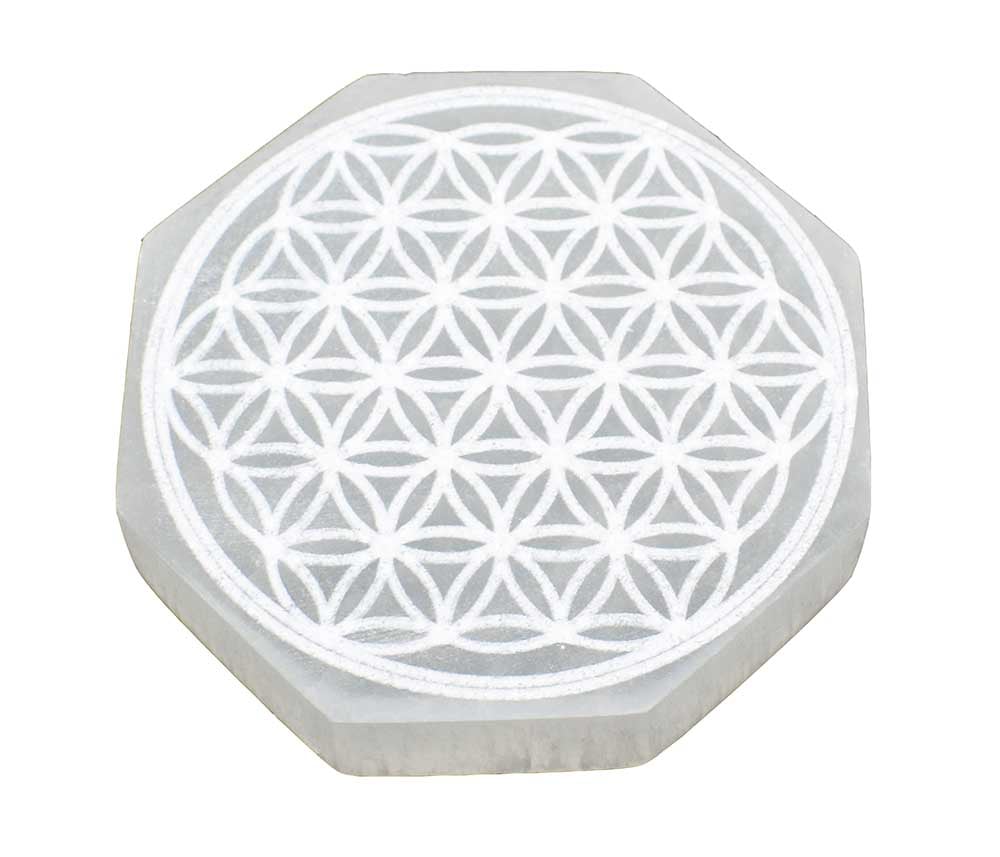 This beautiful Selenite healing crystal is polished and shaped into a beautiful shape of an octagonal charging plate engraved with a Flower of Life pattern.
