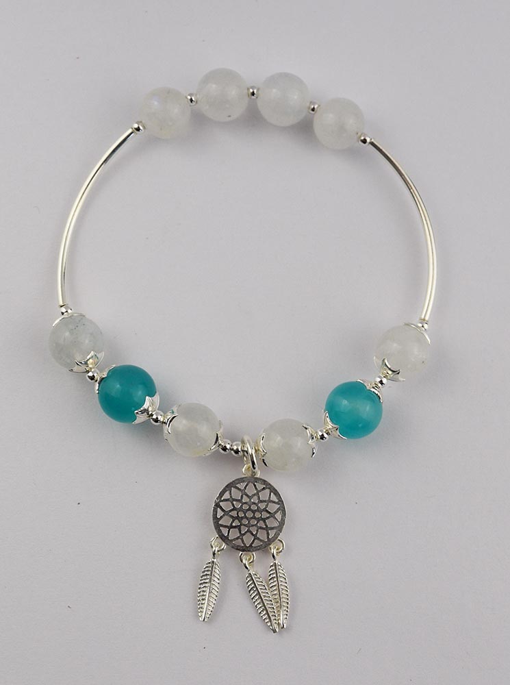 Bracelet Amazonite And White Moonstone With Dream Catcher Charm 925 Sterling Silver