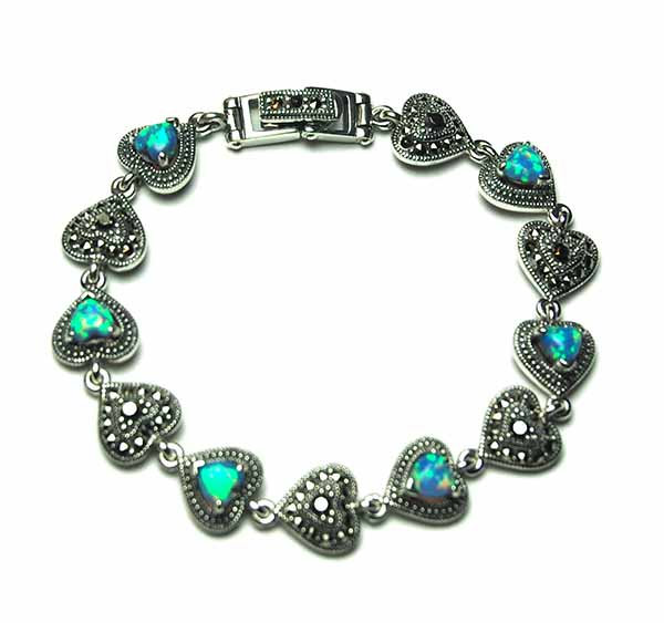 Bracelet Marcasite Hearts Blue Fire Opal With 12 Links 925 Sterling Silver