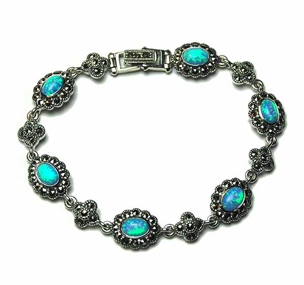 Bracelet Marcasite Oval Blue Fire Opal Stone Flower Design With 12 Links 925 Sterling Silver